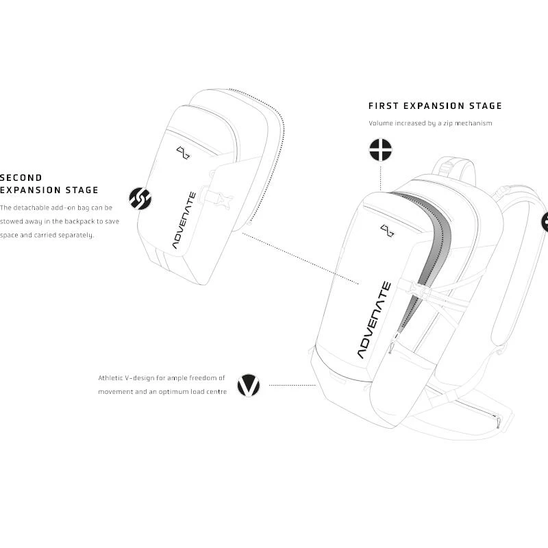 Un sac à dos d’Advenate avec une flexibilité maximale grâce au système d’extension unique.